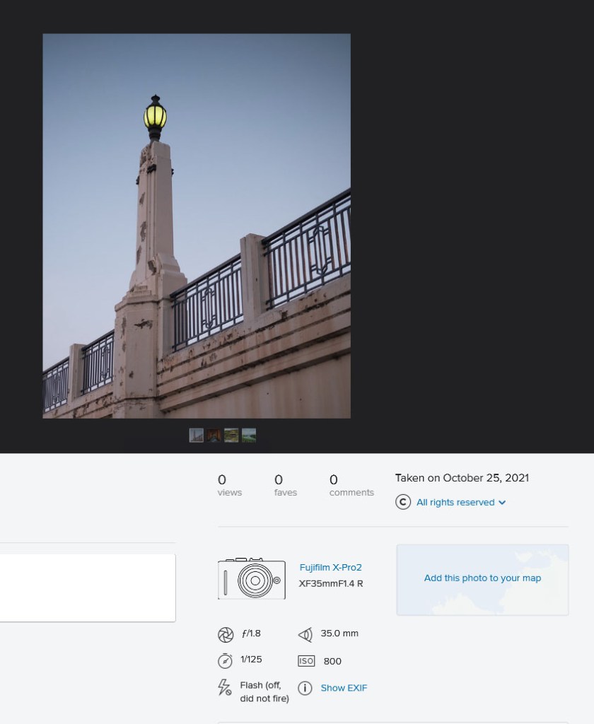 When sending a picture out into the world, I like to make sure that there’s no private info on it, but I also like to have my name on it somewhere. Some metadata is also important for displaying the picture properly. In social media, metadata use varies by platform: sites like Facebook and Reddit will strip metadata from images when you upload them. More photography-oriented sites like Flickr, 500px and DeviantArt will display any camera setting info that the file contains: