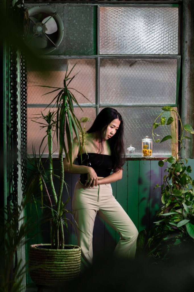 This time, I settled on green and cyan. I found them interesting together, because they are so similar, close on the colour wheel, but also different: green is natural and cyan is artificial. Getting the light right on Thuy’s face was quite tricky. To make the backdrop light I just put a plant in front of a spotlight. Still, these are really unplanned shots. In both cases, I didn’t bring anything in, just used plants and furniture that was sitting around the building already. I didn’t have any lighting plan.