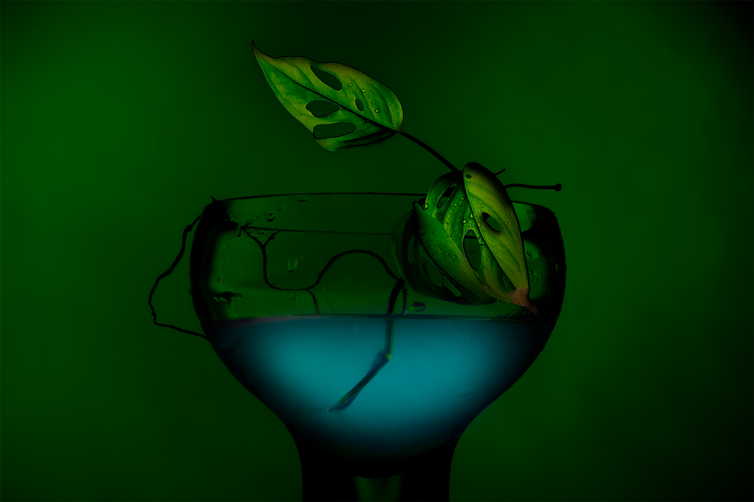The lighting for this ‘cocktail’ was also pretty simple. The shot I wanted wasn’t actually what I ended up with. A photo I made while setting up the lights really struck me with its silhouette, so I used Photoshop to combine it with a high-key shot and that was the result. The liquid is water with a couple of drops of coconut oil blended in, and some food colouring. It unfortunately led to the death of cutting, even though I washed it afterward.