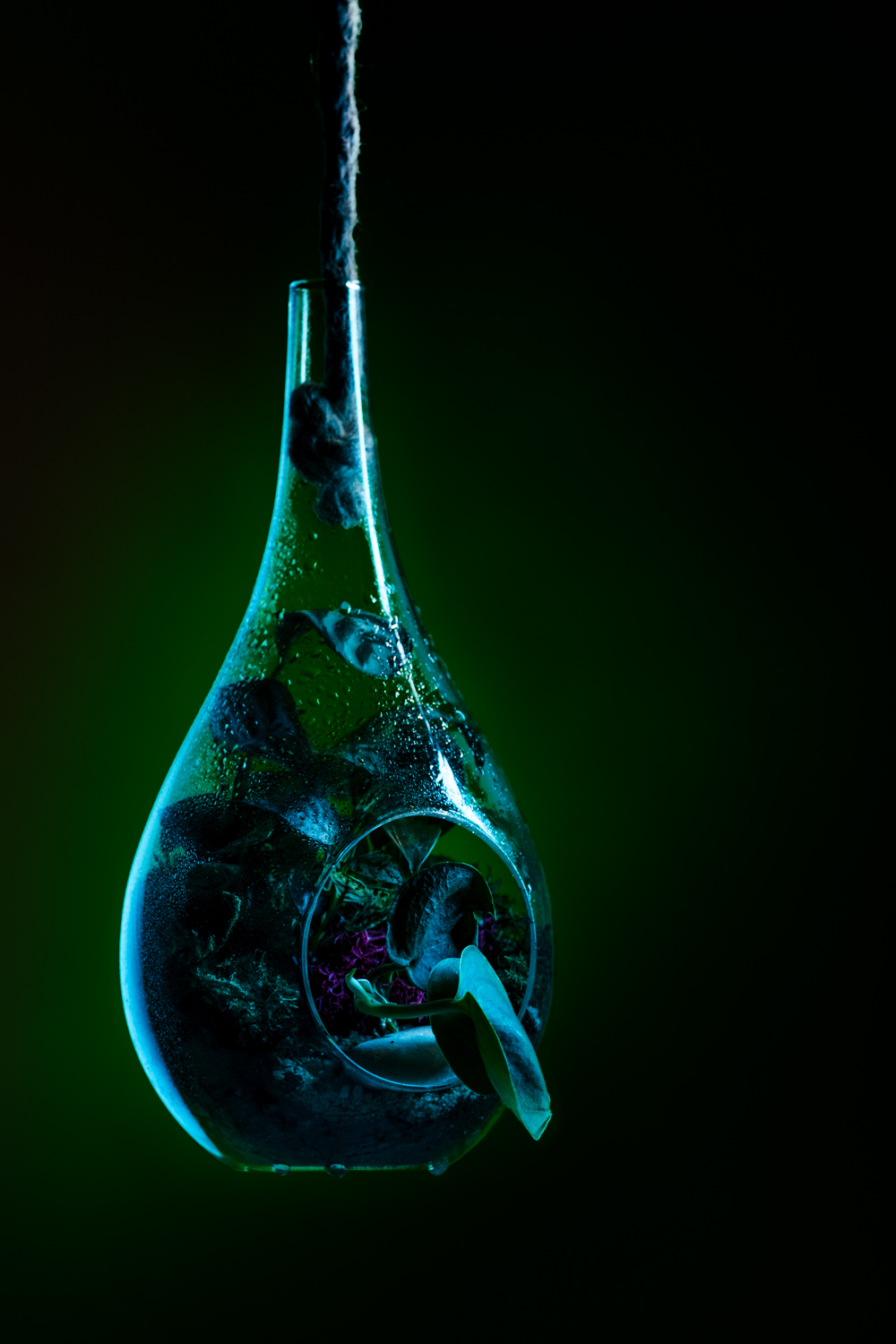 I found this terrarium at a market, and the setup was pretty simple. I used a 50/50 mix of water and glycerin to make the spray drops, and help to soften the reflections a bit. The whole thing would swing with any air current, so I wasn’t able to stack the shot.